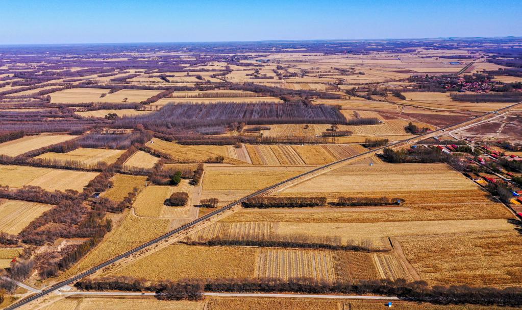 10月13日,这是通辽市奈曼旗义隆永镇方家营子村待收的玉米。(无人机照片 新华社记者连振 摄)