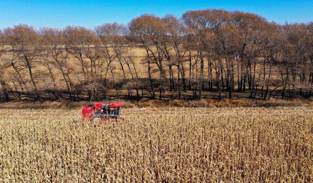 10月18日,这是通辽市奈曼旗新镇正在收获的玉米地。(无人机照片 新华社记者 连振 摄)