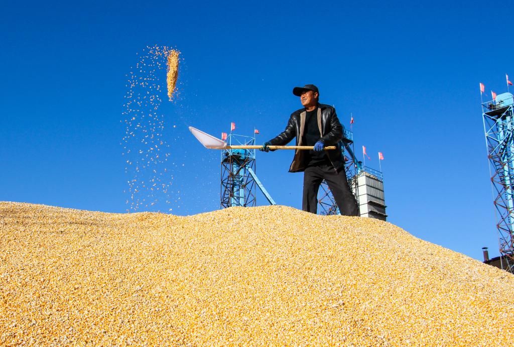 10月18日,在奈曼旗新镇舍布日图嘎查的一家收粮站,一名工人在晾晒玉米。(新华社记者连振 摄)