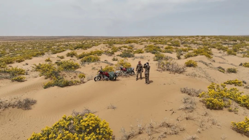 在腾格里额里斯镇查拉格尔嘎查公益林区,沙冬青灌木丛错落分布,金黄色的花朵层层叠叠、挂满枝头,每一朵花都小巧精致,花瓣质地厚实,在微风中轻轻摇曳,将原本荒芜的沙漠装扮得生机盎然,仿佛是大自然馈赠的金色织锦。
