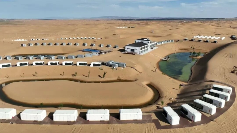 走入腾格里额里斯镇乌兰哈达嘎查,漠西戈·沙漠宿集露营地让人眼前一亮,这里没有传统的酒店大楼,取而代之的是散落在沙海中的星空帐篷、未来感十足的太空舱和火星基地主题屋。营地负责人张华正在通过直播和短视频,介绍民宿院落的设施以及周边的景观。